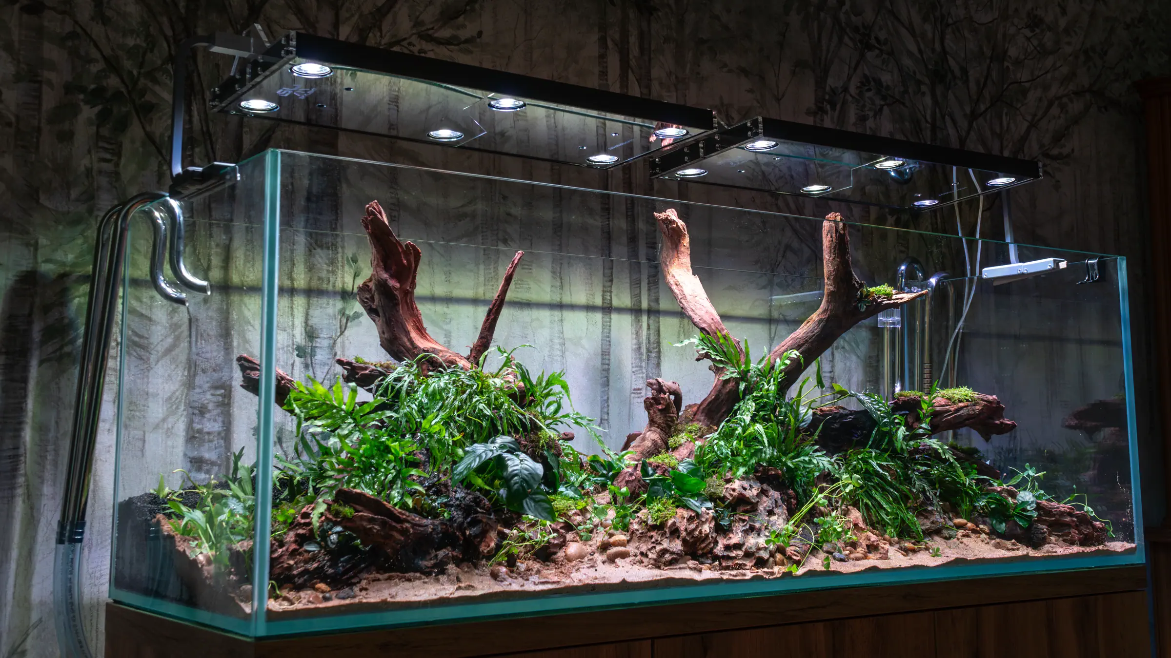 Aranżacja opiera się na pionowo ustawionych, rozgałęzionych korzeniach, które organicznie nawiązują do fototapety z motywem leśnym w tle – tworząc wrażenie, jakby zbiornik był naturalnym przedłużeniem ściany. Roślinność dobrana celowo: gatunki wolnorosnące, niewymagające częstych cięć, obsadzone przy podstawie korzeni, zachowują otwartą przestrzeń wodną. Efekt końcowy to kompozycja dekoracyjna, ale jednocześnie funkcjonalna i przyjazna w codziennej pielęgnacji.